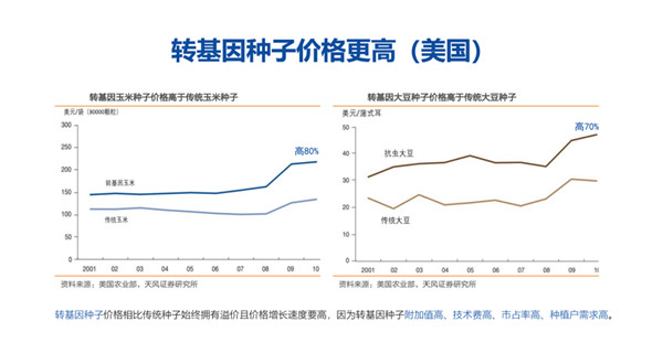 轉(zhuǎn)基因種子價(jià)格相比傳統(tǒng)種子始終擁有溢價(jià)目?jī)r(jià)格增長(zhǎng)速度要高,因?yàn)檗D(zhuǎn)基因種子附加值高、技術(shù)費(fèi)高,市占率高,種植戶需求高。