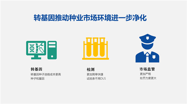 轉(zhuǎn)基因推動(dòng)種業(yè)市場(chǎng)環(huán)境進(jìn)一步凈化,轉(zhuǎn)基因種子透假成本更高(種子和基因);檢測(cè)更加簡(jiǎn)單快捷,用試紙條即可,不用進(jìn)行 DUS ;市場(chǎng)監(jiān)管更加嚴(yán)格,處罰力度更大。