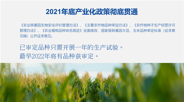 2021 年底產(chǎn)業(yè)化政策徹底貫通。《農(nóng)業(yè)轉(zhuǎn)基因生物安全評(píng)價(jià)管理辦法》,《主要農(nóng)作物品種審定辦法》、《農(nóng)作物種子生產(chǎn)經(jīng)營(yíng)許可管理辦法》、《農(nóng)業(yè)植物品種命名規(guī)定》全面修改,國(guó)家級(jí)轉(zhuǎn)基因大豆、玉米品種審定標(biāo)準(zhǔn)(征求意見稿)公開征求意見。已審定品種只需開展一年的生產(chǎn)試驗(yàn),最早 2022 年將有品種獲審定。