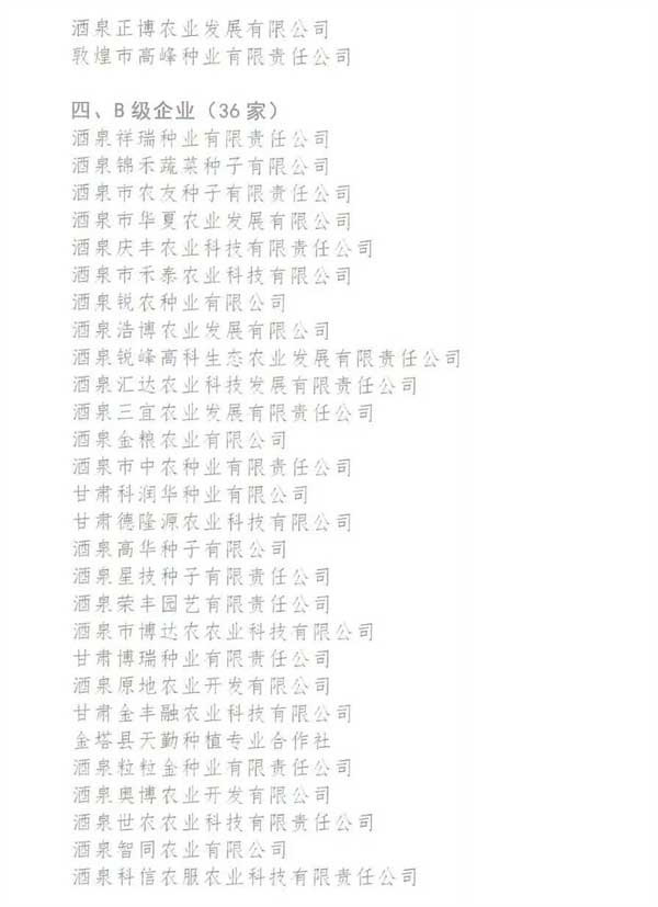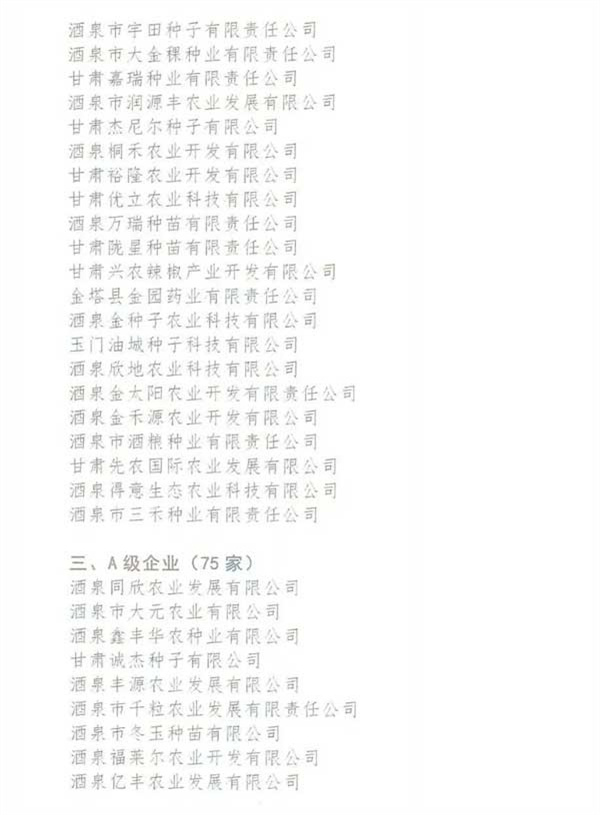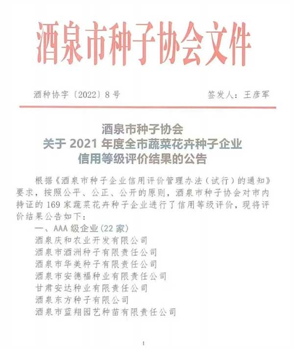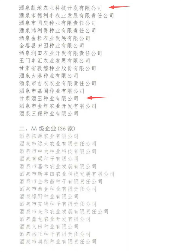 酒泉?jiǎng)P地農(nóng)業(yè)科技開發(fā)有限公司、甘肅酒玉種業(yè)有限公司被酒泉市種子協(xié)會(huì)評(píng)選為AAA級(jí)企..