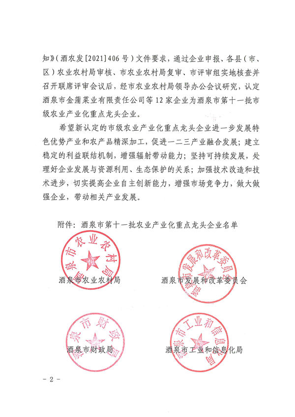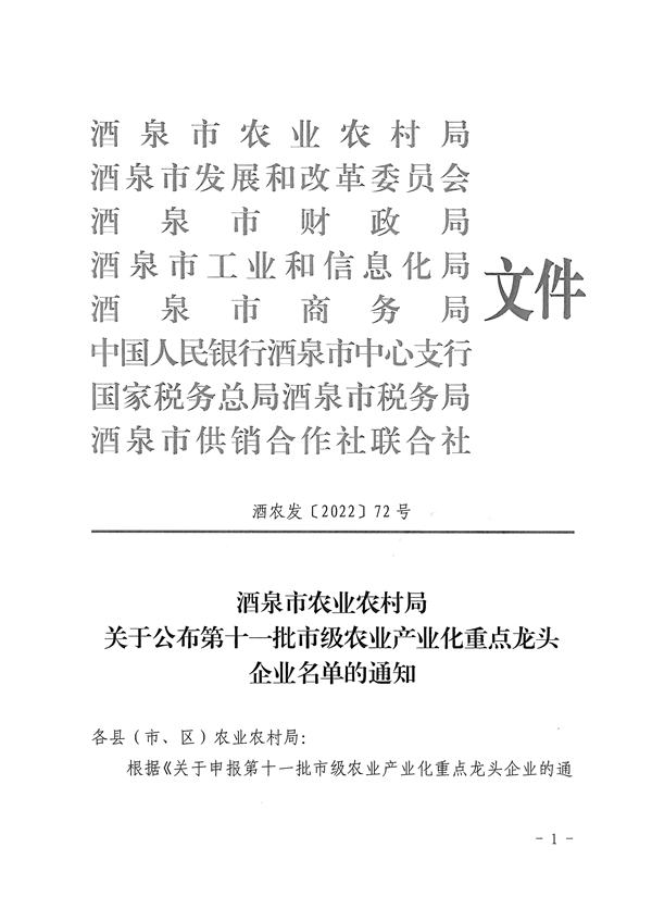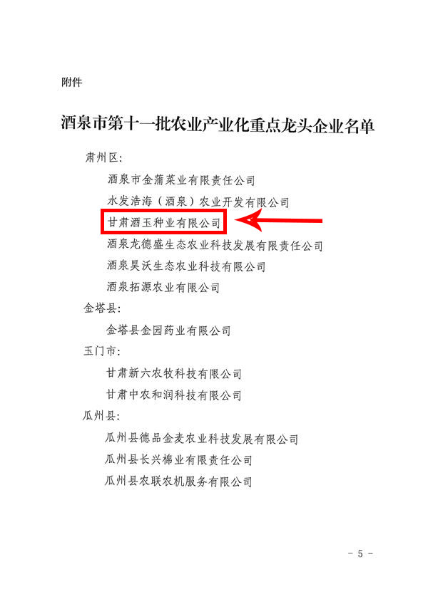 祝賀甘肅酒玉種業(yè)有限公司被認(rèn)定為酒泉市農(nóng)業(yè)產(chǎn)業(yè)化市級龍頭企業(yè)