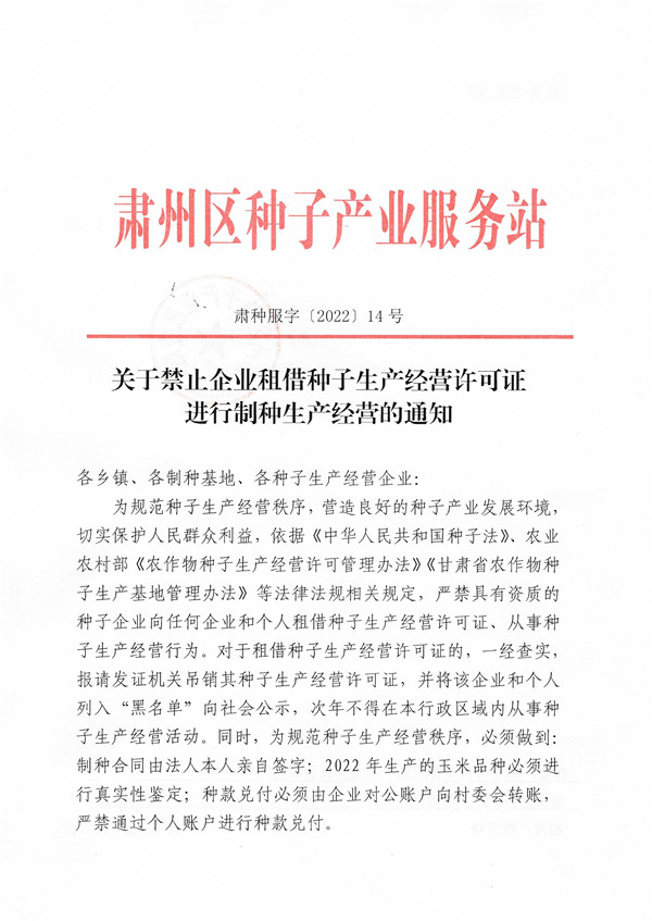 關(guān)于禁止企業(yè)租借種子生產(chǎn)經(jīng)營許可證進行制種生產(chǎn)經(jīng)營的通知
